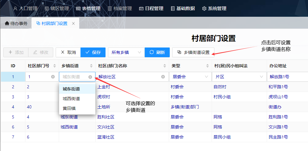点击【乡镇街道设置】,添加、修改乡镇街道名称等信息。