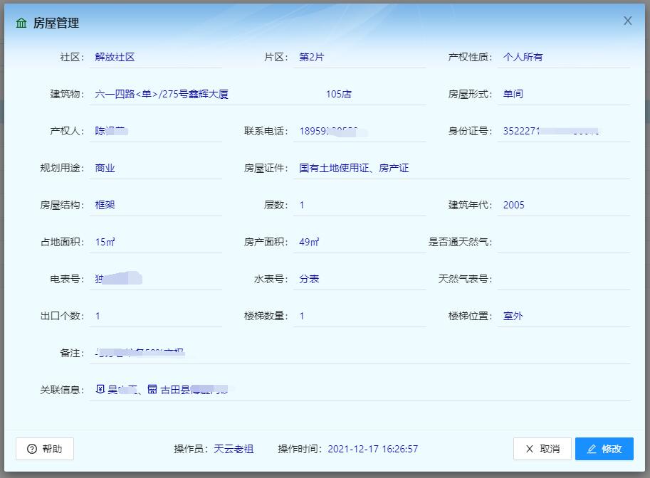 其中的关联信息会显示本房屋相关的出租、商户、住户信息。