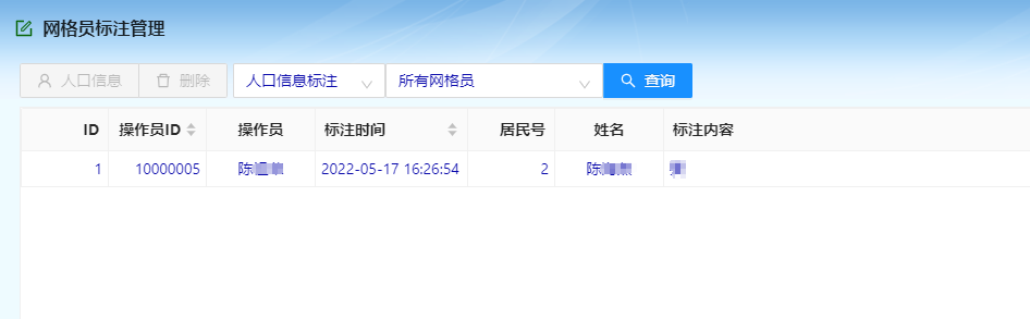在电脑端使用有社区管理员或标注管理的账号登录,在人口详情窗口可以查看网格员标注信息。