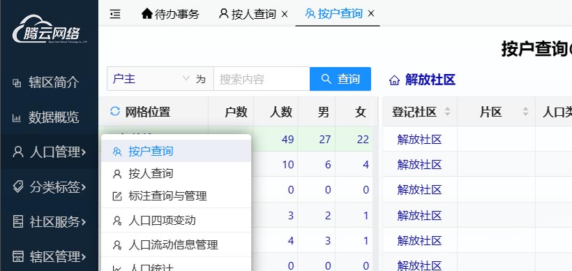 按人查询,可以查询所有人的数据。快捷查询的内容有:居民小组、姓名、家庭地址、人口状态。